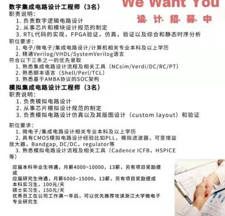 近期由于业务拓展的需要,招聘集成电路研发工程师和实习工程师,岗位需求如下: