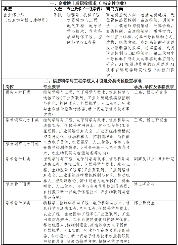 热爱教育事业,理想信念坚定,师德高尚,学风正派,治学严谨,具有良好的合作精神,身心健康,全职到岗工作。完成企业博士后工作年限后可直接作为信息学院相应人才类别予以引进,企业博士后引进面试由校企协同完成。