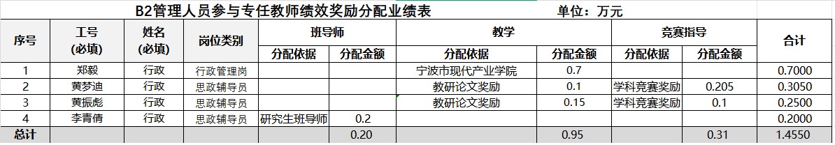 附表:管理人员参与专任教师绩效奖励分配业绩表 (单位:万元)