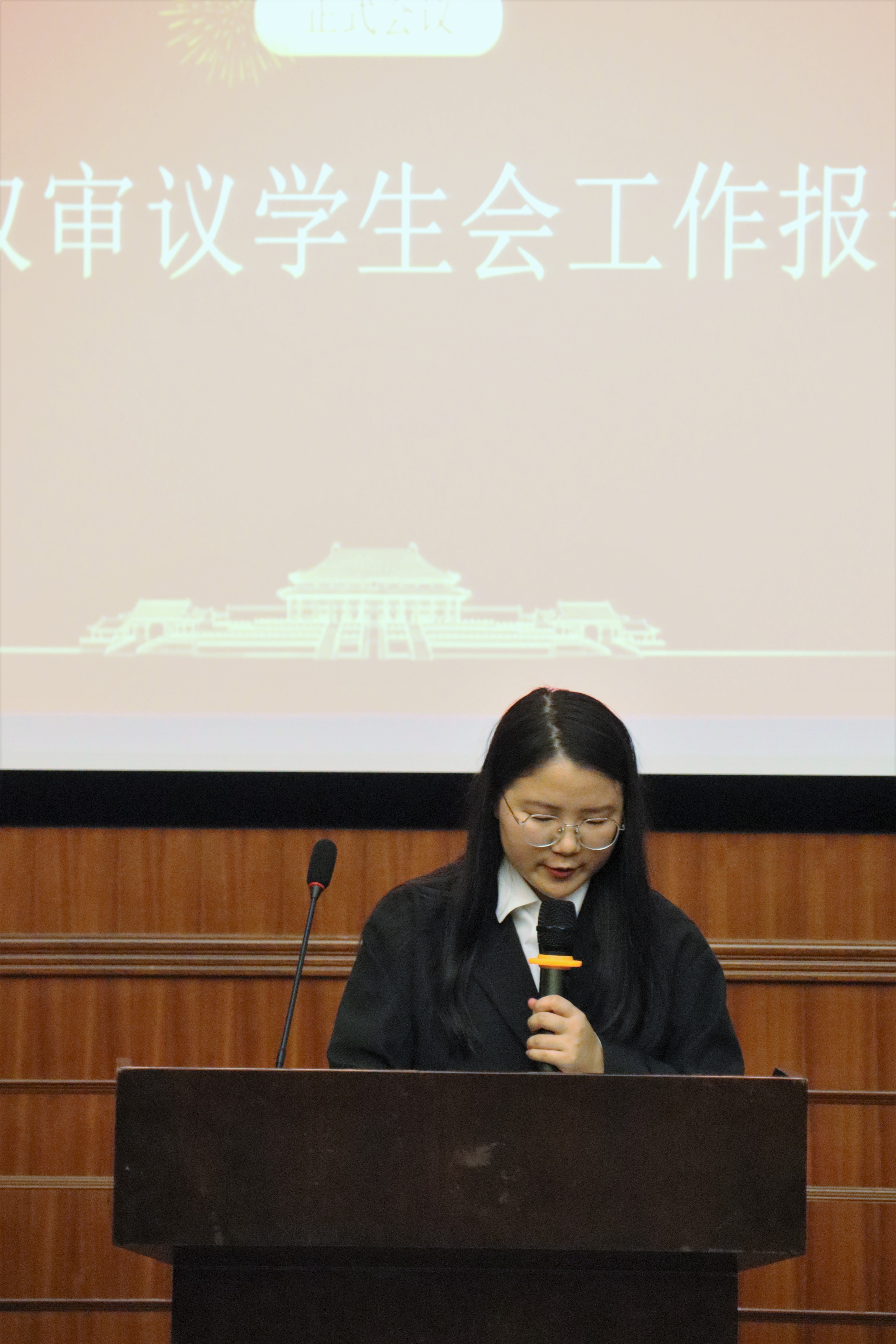 开幕式后,第一次全体会议在模拟法庭召开。施燕代表第六届学生委员会代表作了题为《追梦时代,筑梦青春,不负韶华》的工作报告。报告就第六次学生代表大会以来学生会的工作情况进行了总结,对今后的工作做出了规划和展望。