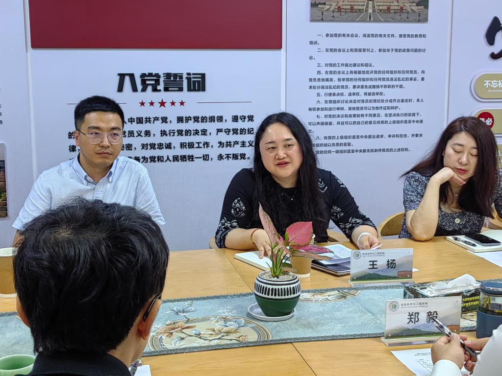 信息学院党委书记郑毅为王杨书记一行介绍了学院办学成果及党建工作阵地建设情况;在沈非凡副院长带领下,来访嘉宾参观了学院5G工业互联网创新实验室并给与了高度的评价和赞许。