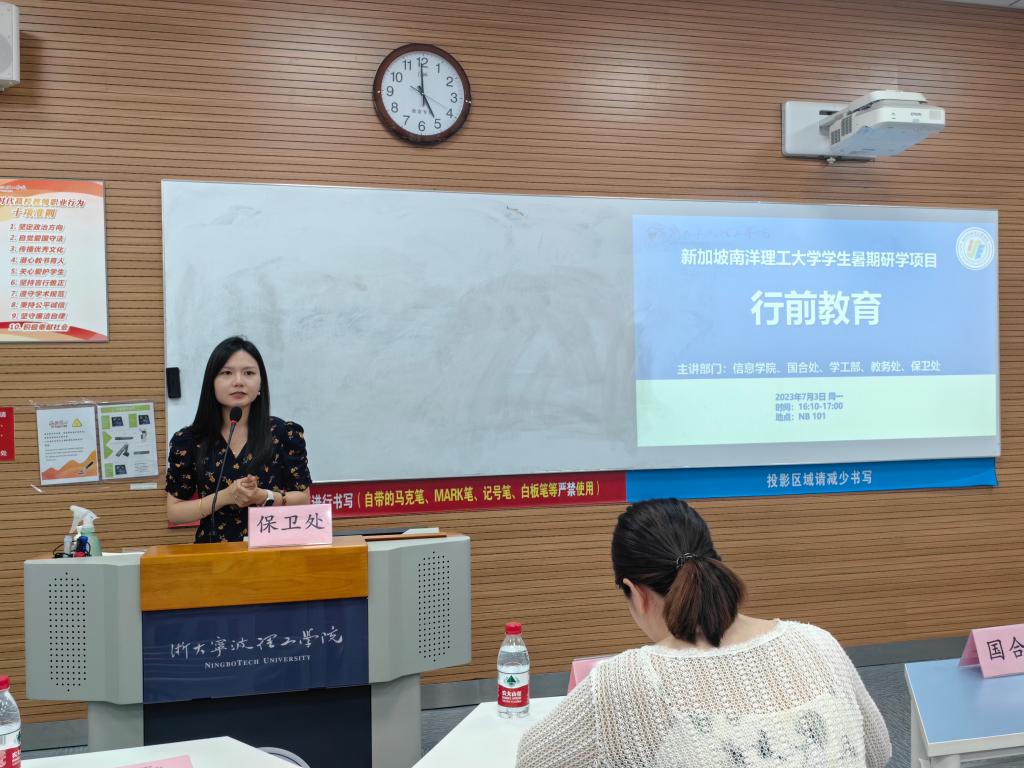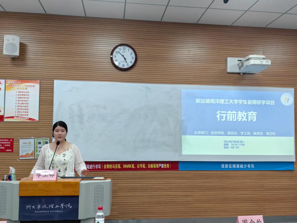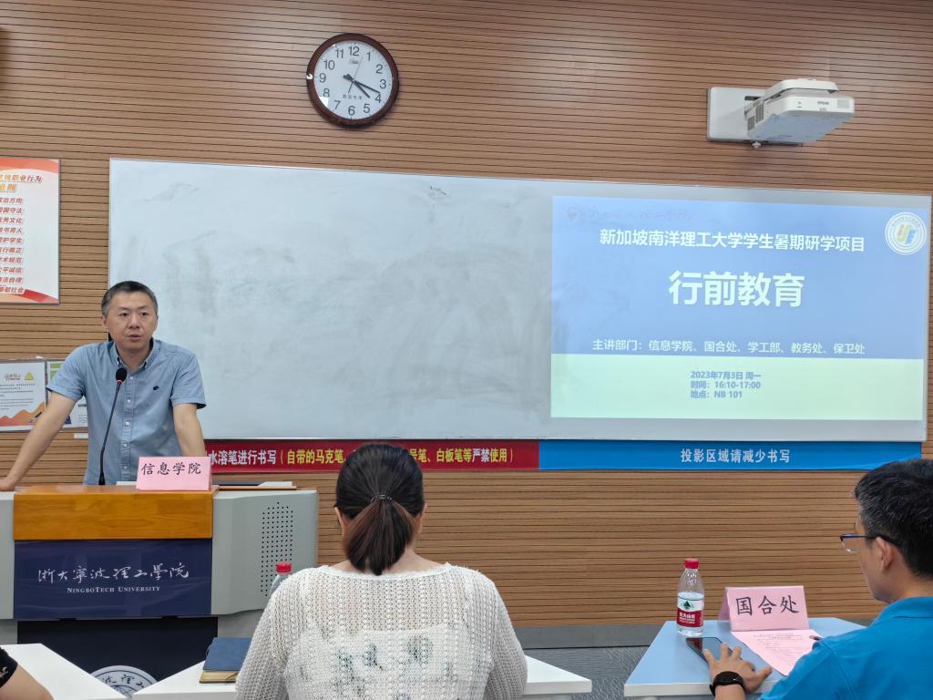 为了确保学生赴新加坡南洋理工大学暑期访学团工作顺利实施,2023年7月3日下午,信息学院联合国合处、学工部、保卫处和教务处共同举办新加坡南洋理工大学学生暑期研学项目行前教育。会议由信息学院副院长沈非凡主持,学院党委书记郑毅、国合处副处长程萌、学工部高雅姝、保卫处仇梦华、教务处葛宁欢、信息学院有关教师和全体参团学生参会。访学团师生接受了安全教育与出国(境)纪律教育。