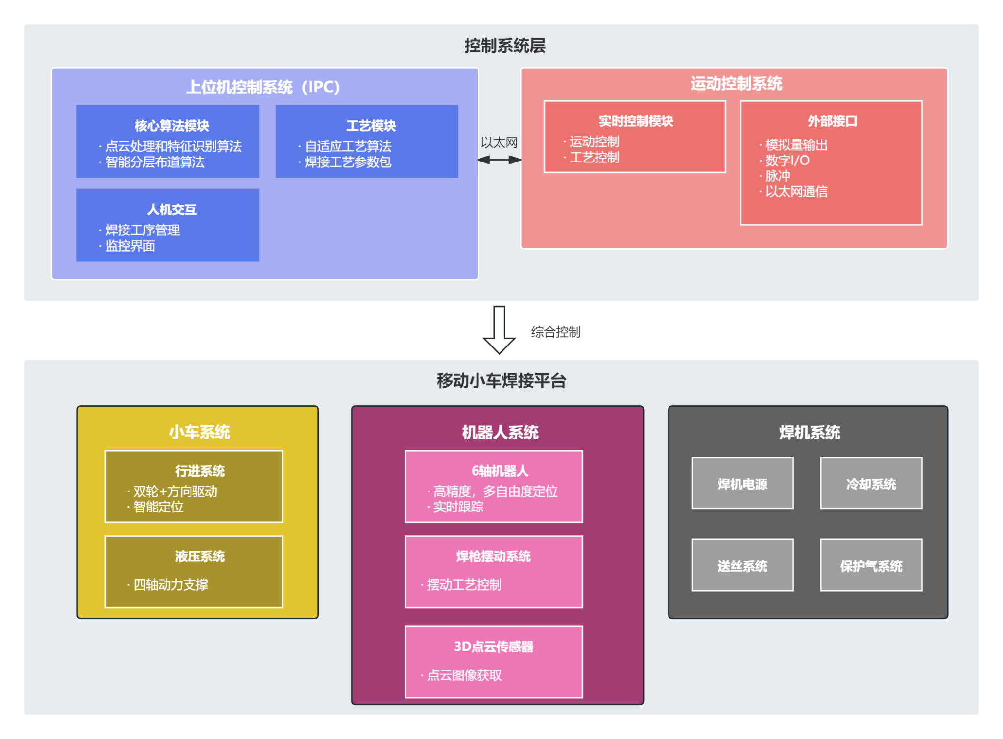 该解决方案创新性采用“硬件集成+智能算法+工艺适配”技术路线,构建了分层架构与模块化集成的系统框架。核心突破包括:全向移动小车搭载6轴机器人,实现直行、横行、原地旋转等多姿态运动,作业范围覆盖8米以上长集合管,突破传统固定焊接设备的空间约束;末端专用支架集成3D点云传感器与自主摆焊机构,通过视觉识别技术精准提取焊缝轨迹,配合智能分层布道算法,实现多层多道精准焊接;TIG电源与定制微型焊枪组合,有效解决狭窄空间操作难题,缺陷率趋近于零。经实际测试,该机器人焊接效率较传统人工提升30%,角变形接近0,可适应高温高压等恶劣工况,为大型集合管焊接提供了安全高效的自动化解决方案。