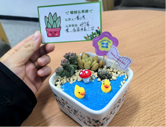 “种下希望,收获未来”。同学们在亲手种植的多肉旁写下了自己对于认养多肉的期许,也带着这份责任与热爱,将绿色理念融入日常。活动现场,大家小心翼翼填土、摆放、浇水,在指尖劳作中体会生命的蓬勃,在趣味互动中传递环保初心。
