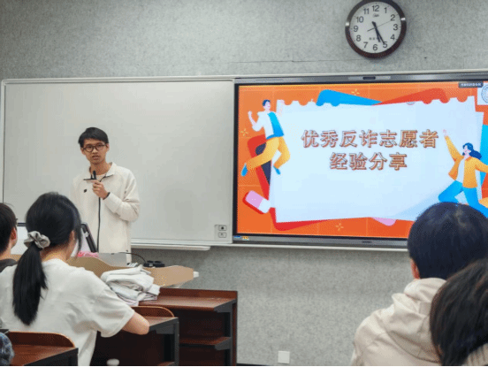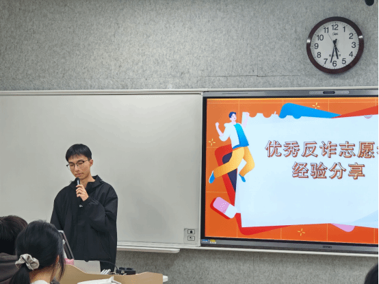 表彰结束后,陈锦亿、杨橘佳、杨瞻远三位优秀志愿者代表结合自身工作实践,分享了班级反诈宣传的宝贵经验。他们围绕贴近日常生活、贴合学院特色的要求,结合学生日常场景与沟通特点提出,反诈宣传不能仅依赖线上转发,更应立足线下、贴近同学,同时还给其他志愿者分享了关于如何宣讲以及何时宣讲可以提升宣讲效果的经验。大家总结出“精简案例、高频分享、活用身边真实案例” 的实用方法,强调要用同龄人易懂、爱听、能记住的语言,让防骗意识真正入脑入心。与会志愿者也积极交流探讨、互相借鉴经验,进一步提升反诈宣传能力。