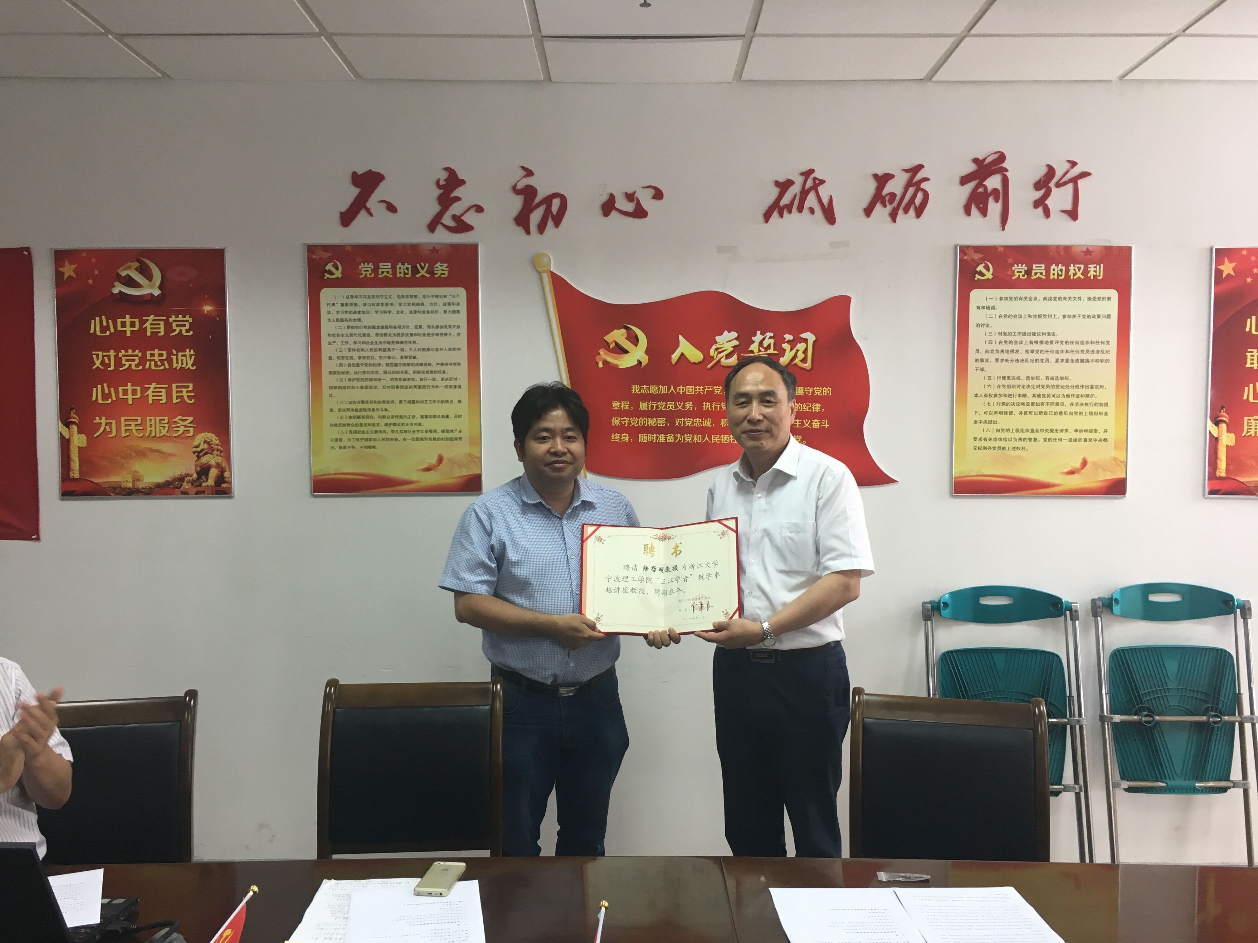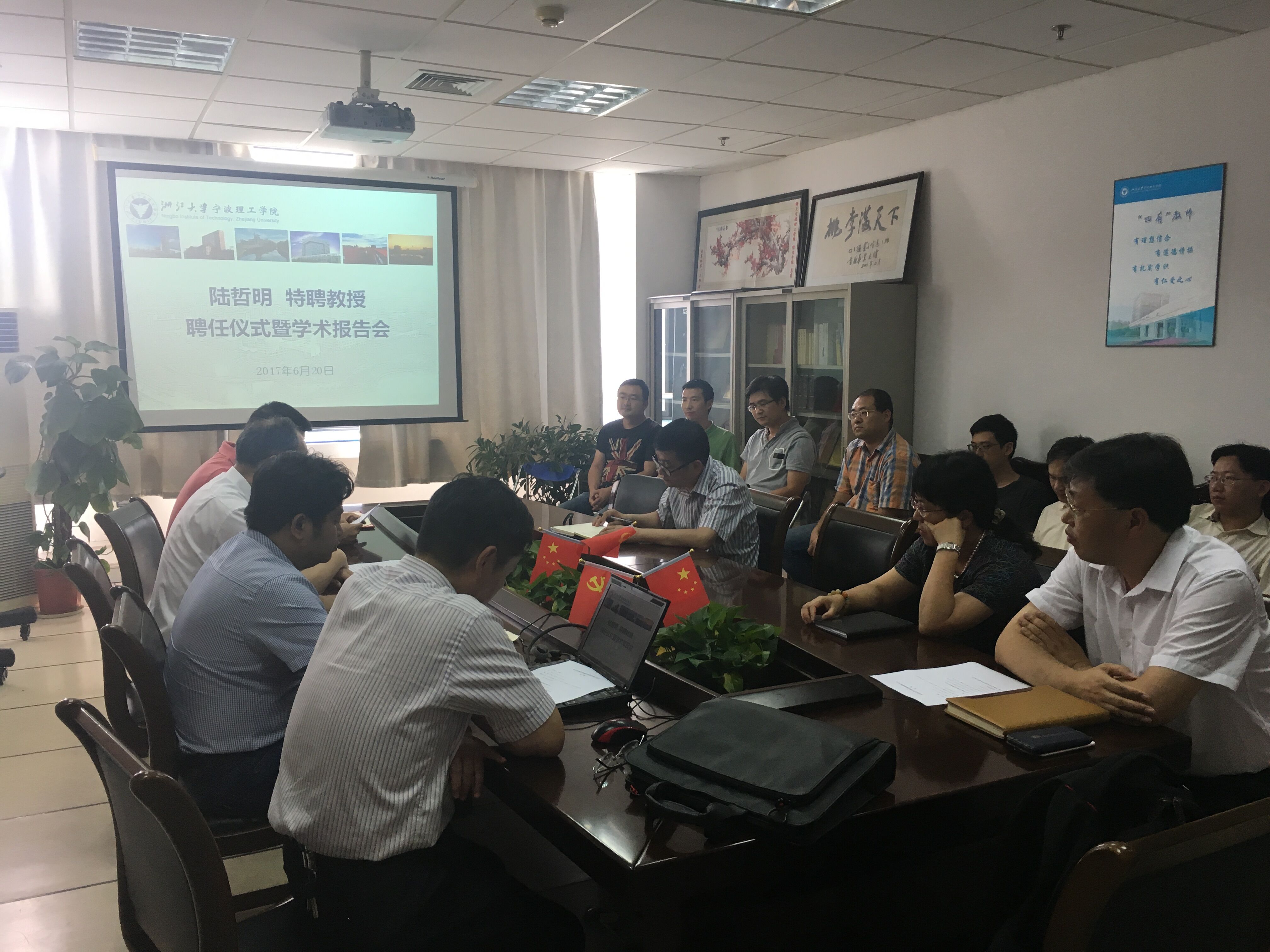聘任仪式上,人事处吕朝晖处长介绍了陆哲明教授的个人简历和主要业绩。费英勤书记向陆哲明教授颁发了聘任证书,并为陆教授佩戴了校徽。费书记对陆教授加盟我校表示热烈欢迎。他简单介绍了“9211计划”项目背景,就是通过宁波市政府的专项经费支持,使宁波理工学院能够吸引更多的浙江大学高水平的知名教授到宁波来工作,更加充分地发挥好浙江大学的学科资源与人才优势,为宁波理工学院的办学水平的快速提升再助一臂之力,为宁波推进经济转型发展、加快建设现代化国际港口城市提供强有力的人才和科技支撑。费书记说,陆教授的加盟将对学院现有的学科、人才团队给予支撑,也与宁波市经济重点发展方向紧密结合,对充实学院高端领军人才队伍,推动学科建设将起到十分有力的作用。他祝愿陆教授在宁波理工学院的工作取得成效。
