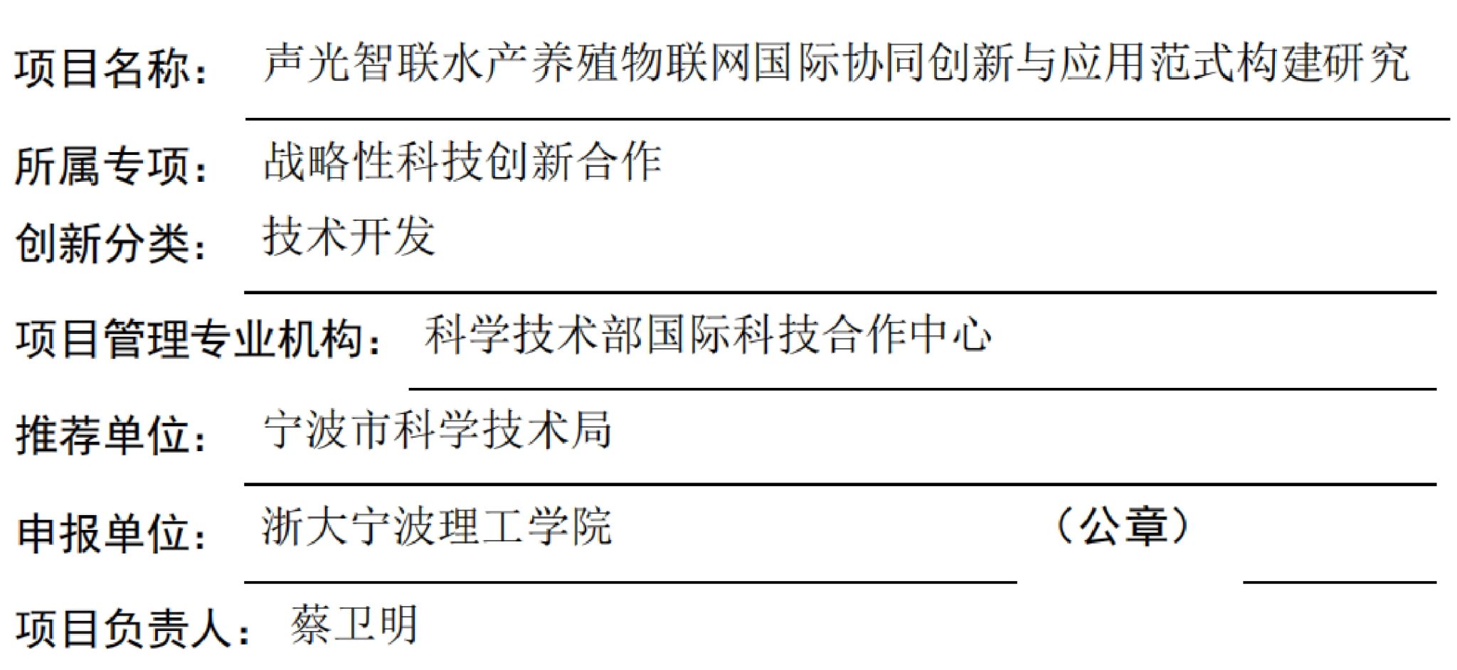 近期,由我院蔡卫明教授主持申报的国家重点研发计划“战略性科技创新合作”重点专项项目“声光智联水产养殖物联网国际协同创新与应用范式构建研究”(2026YFE0208300)获得科学技术部国际科技合作中心立项批准。