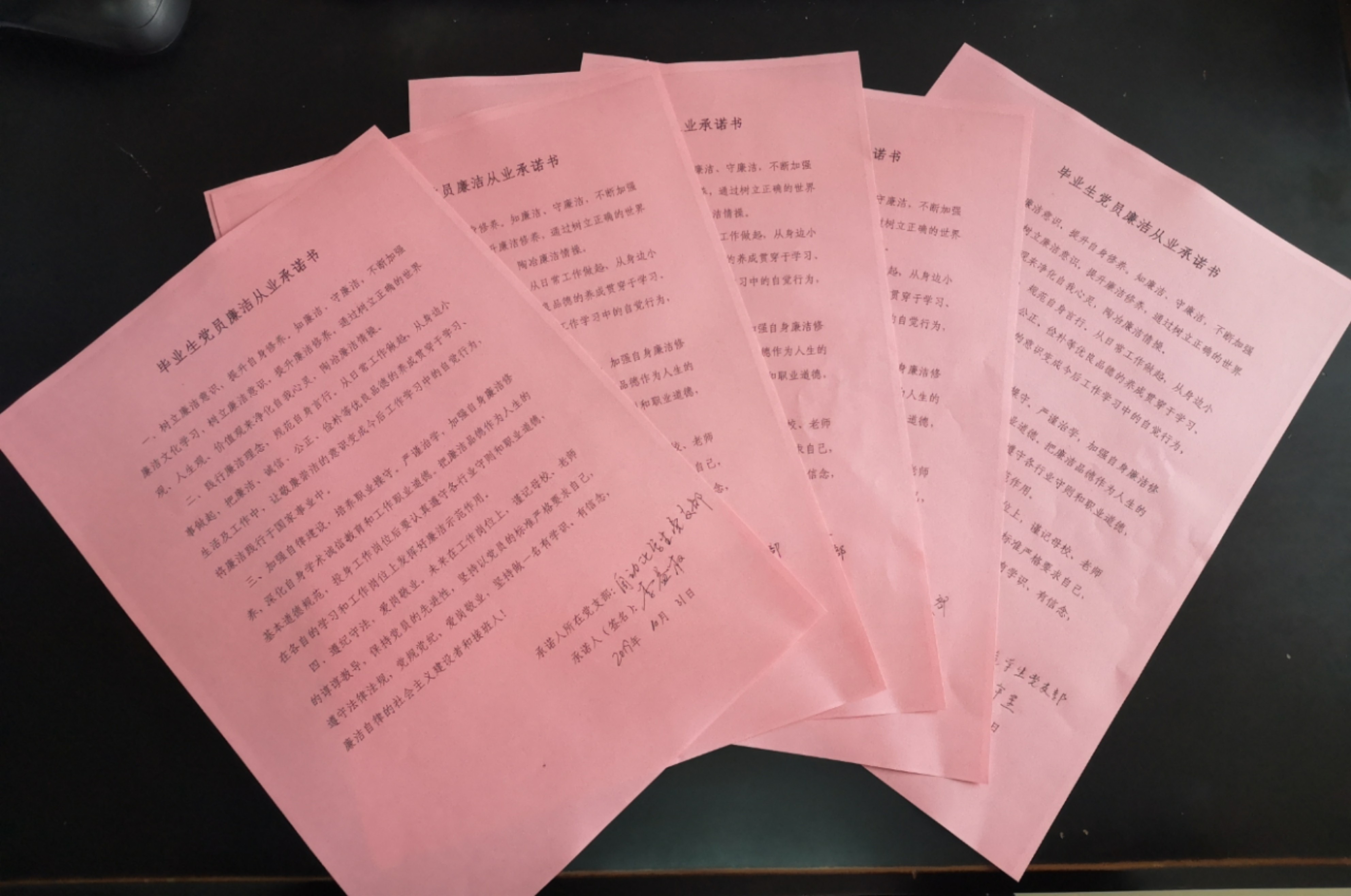 之后,全体党员面向党旗重温入党誓词。面向鲜红的党旗,铿锵的誓言再次让全体毕业生党员回顾了自己入党的初心。最后,党员代表信电学生党支部赵培冲同学倡议全体毕业班党员“廉政从业”,号召党员们在今后的职业生涯当中无论什么时候、做任何事,都一定要守住廉洁自律的底线,不辜负学校和老师的栽培,全体毕业生党员在“廉洁从业”承诺书上郑重签名。