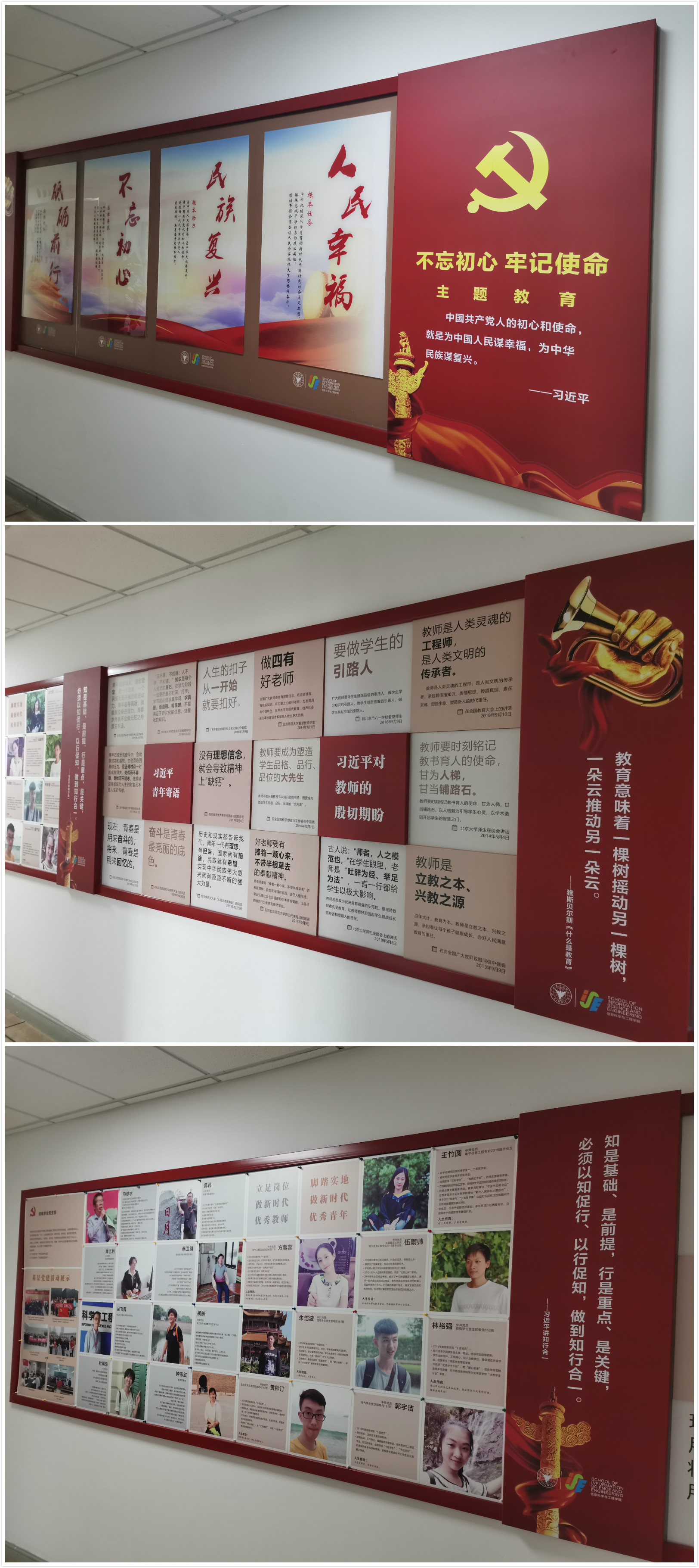 党建宣传墙共分三部分:以主题教育的根本任务、根本动力、总体要求和具体目标为引领;以教育为初心,重点展示了习近平总书记对教师的殷切期盼和对青年的寄语;此外,集中展示了一批脚踏实地、立足岗位的优秀学生和优秀教师的典型事迹。