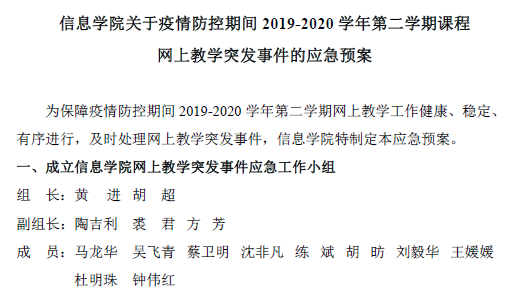 发布网上教学突发事件应急预案。2月23日,学院发布《信息学院关于疫情防控期间2019-2020学年第二学期课程网上教学突发事件的应急预案》。成立网上教学突发事件应急工作小组,明确网上教学基本原则和突发事件应急方案,明确要求各任课老师须制定课程应急预案并及时告知学生群体,落实课后作业布置与批改、答疑等教学反馈环节。应急预案最后公布了直播平台的技术人员等相关人员联系方式,确保及时准确处理任课教师的疑难问题和突发事件。