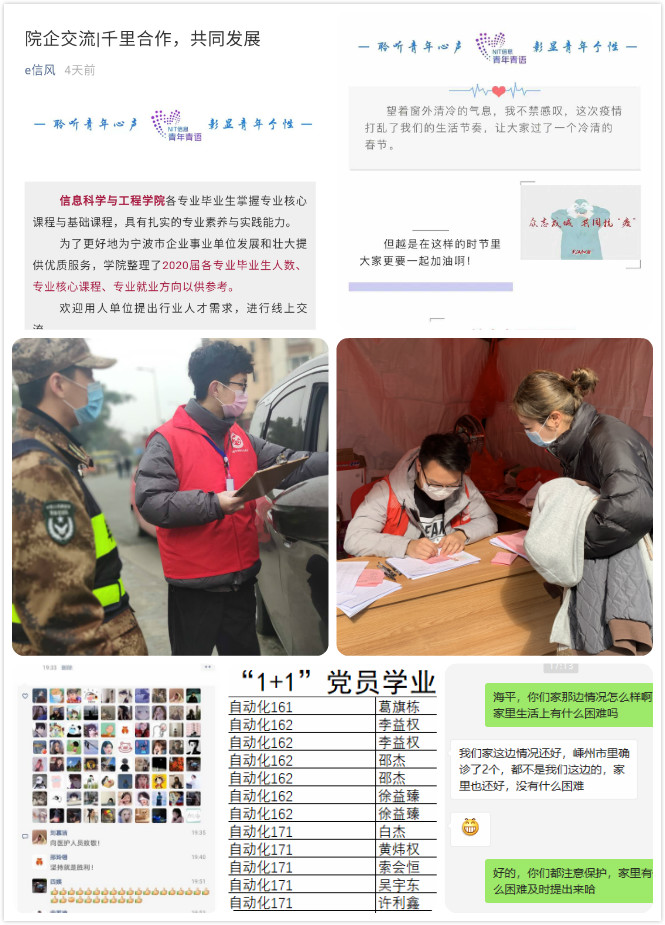 全员参“疫”,齐心协力打好学生防疫工作组合拳。自疫情爆发以来,学院建立了以党委—辅导员—班导师—学生干部四级联动的学生防疫工作指导体系。依托班长、班导师,以问卷星等形式开展拉网式的排查,建立了学院重点疫情学生库;开展全体学生钉钉每日健康打卡,并做好排查的分析与跟踪;积极落实因疫致困学生的经济补助工作;开展辅导员全员参与的疫情期间学生心理疏导工作;充分发挥党员先锋作用,建立了“1+1“学困生在线帮扶,开展”我是党员,我承诺“防疫宣传活动;第一时间排查毕业生考研成绩,为复试精准指导打下坚实基础;积极推动毕业生“网络就业”,疫情期间招聘信息不间断;建立信息学院-企业交流微信群,主动出击,积极推动毕业就业工作。