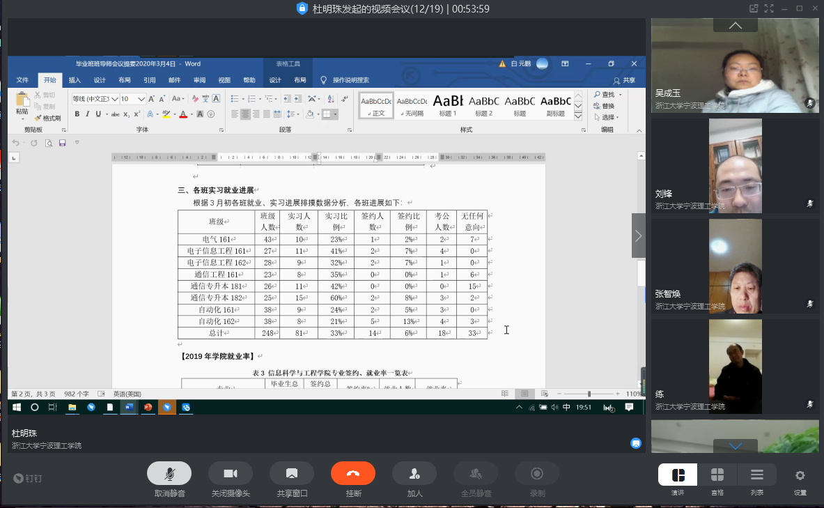 受疫情影响,毕业生就业工作遭遇了前所未有的严峻挑战,为充分调动学院师资力量和各方资源,确保本年度就业工作顺利有序推进,3月5日晚,信息学院召开“云会议”推进就业工作。学院院长黄进、党委书记胡超、党委副书记方芳,各研究所所长、全体支部书记及毕业班班导师参加会议。
