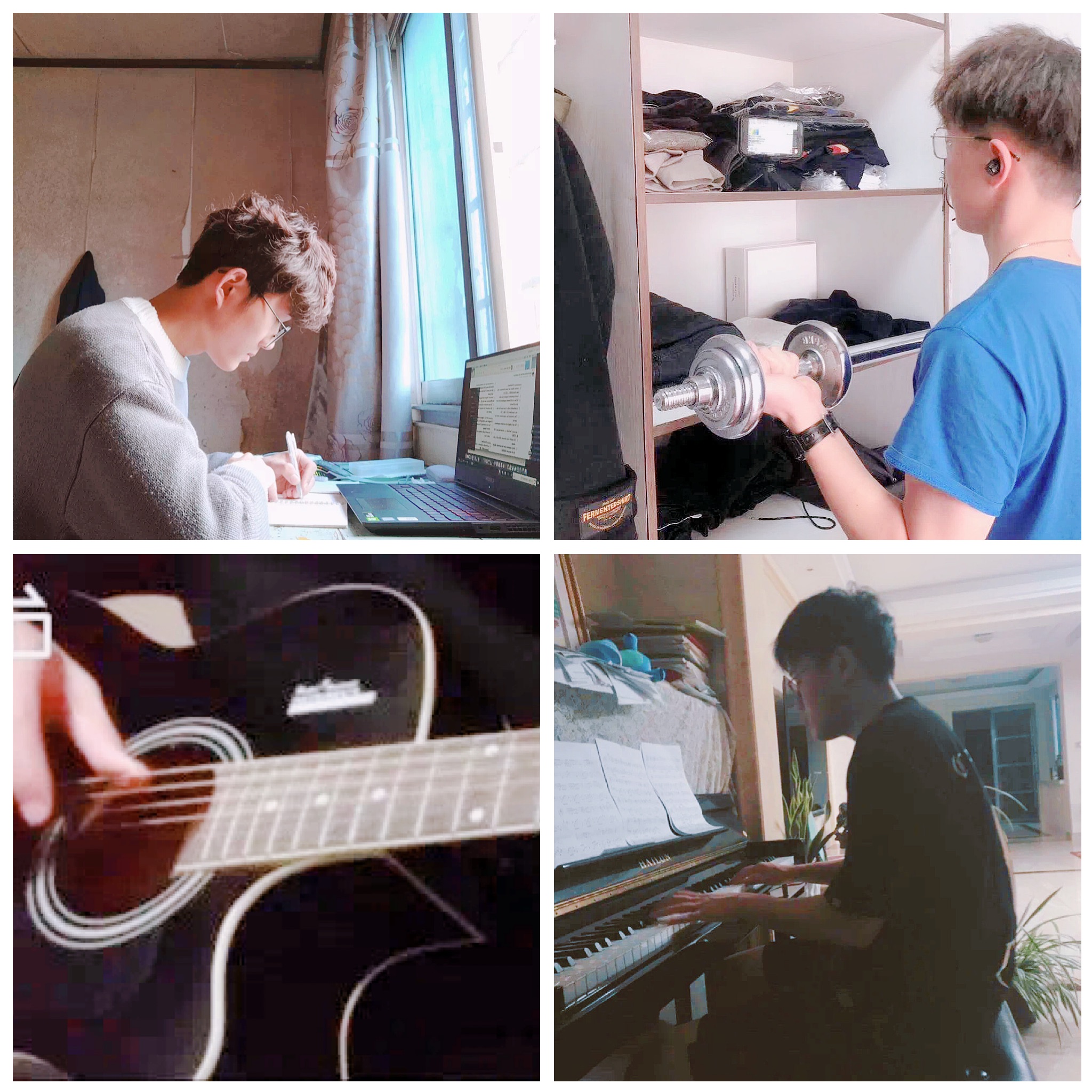 作为学生,学习是最不可忽视的,不论我们身在何地,学习的劲头一刻也不敢松懈,在家上网课之余们也不忘私下抽空复习。除了学习,体育锻炼也是必不可少。虽然由于疫情原因,不能户外运动,但这无法磨灭同学们运动的激情,比如在家举哑铃、做俯卧撑、跳绳等一些室内的运动。