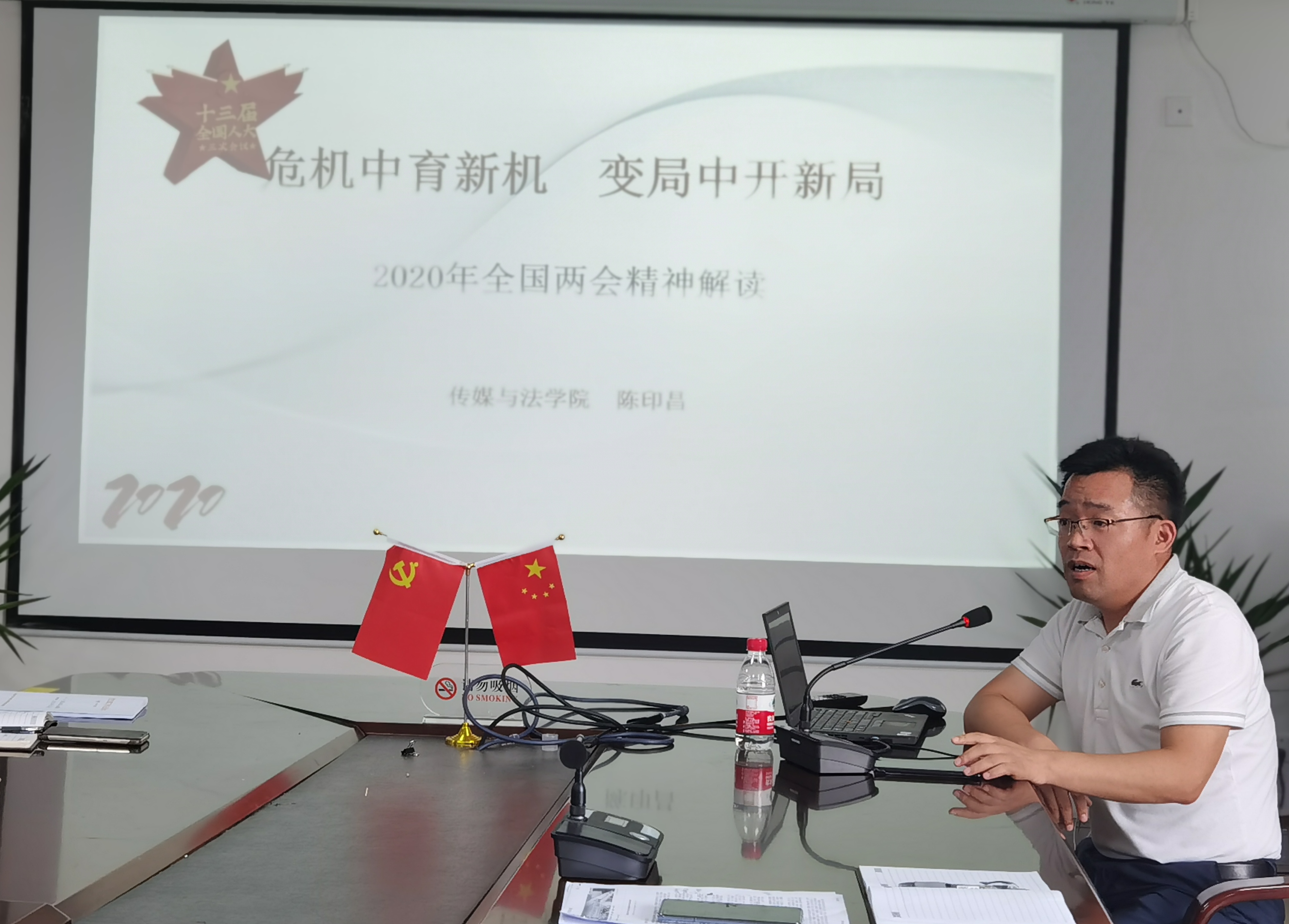 陈印昌老师以“危机中育新机 变局中开新局”为题,详细阐述了2020年全国两会召开的背景、两会的主要内容以及两会召开的意义等内容。生动详实的历史事件解读,佐以幽默风趣的言语说明,近2个小时的报告,让在场的师生党员意犹未尽。