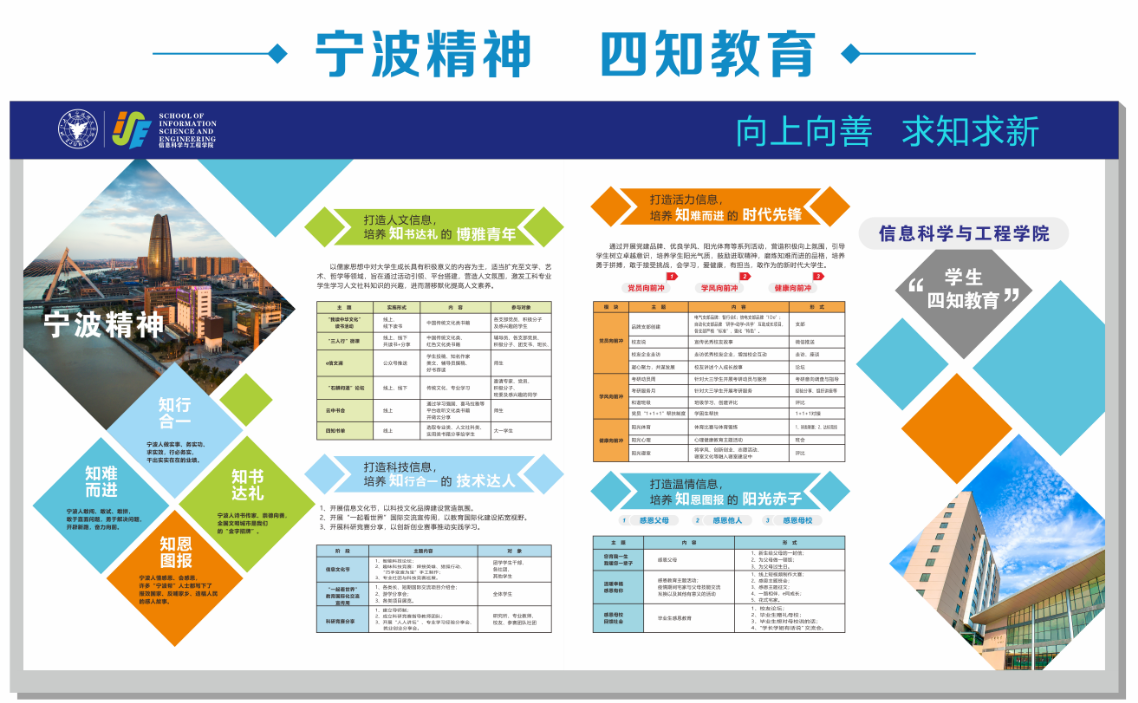 启四知新篇,创信息未来。信息学院结合学院人才培养目标,积极尝试将宁波“知行合一、知难而进、知恩图报、知书达礼”的四知精神融入学生思政教育,打造学院学生“四知教育”品牌,立足提升工科专业学生人文素养,实践创新能力和国际竞争力,全面提升思想政治教育内涵。