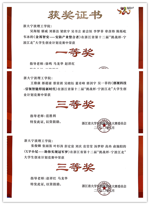 2.学生学科竞赛获奖再创新高。获得省级以上各类学科竞赛奖项18项。其中,获浙江省第十二届“挑战杯”大学生创业计划竞赛一等奖1项(全校最高奖项)、三等奖2项;获浙江省第六届“互联网+”大学生创新创业大赛铜奖1项;获2020年全国大学生电子设计竞赛中获得省一等奖2项,省二等奖1项、省三等奖3项、成功参赛奖4项;获全国大学生智能汽车竞赛获省三等奖2项。