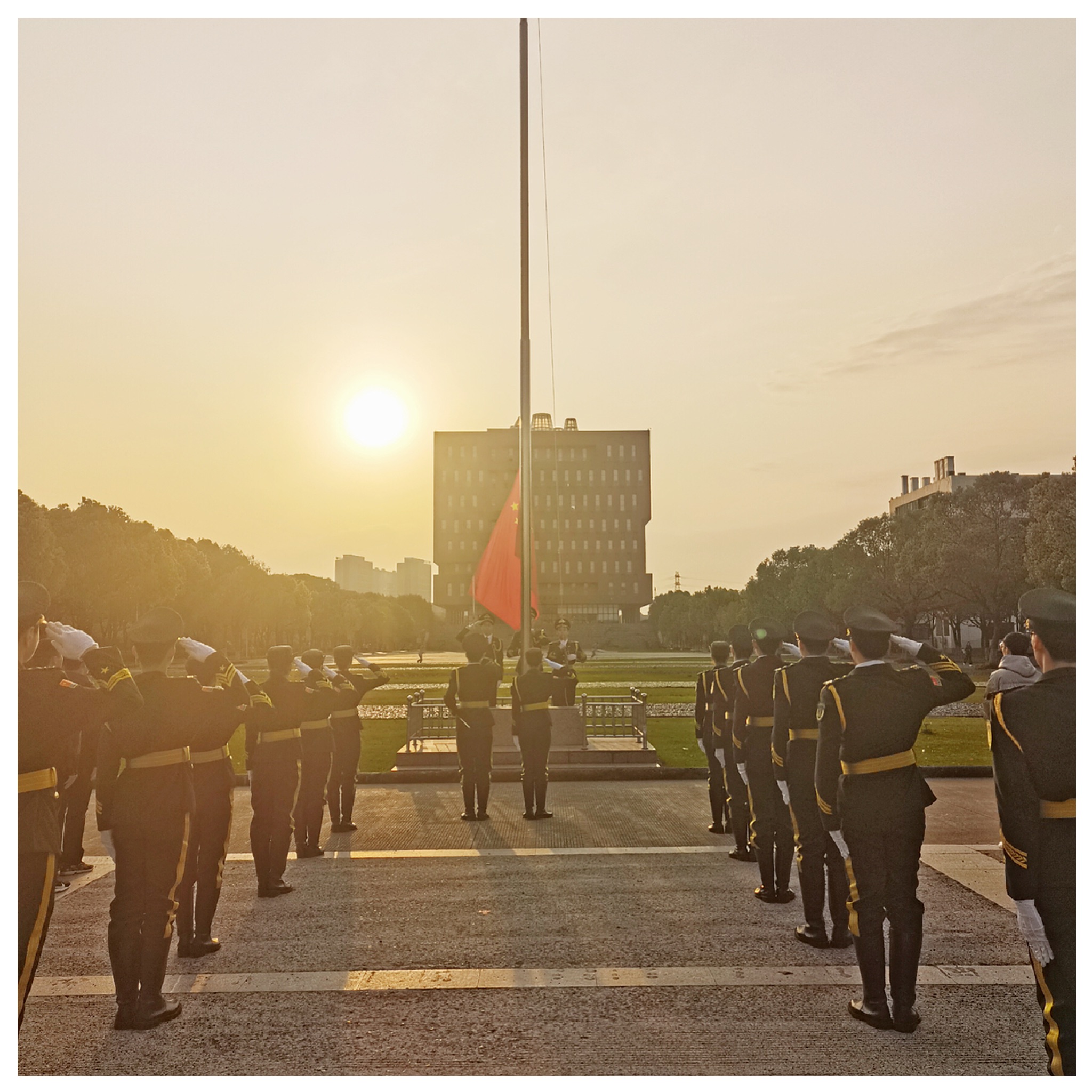 迎着初升的太阳,英姿飒爽的国旗护卫队队员们迈着铿锵有力,整齐划一的步伐护送国旗来到旗杆下。伴随着庄严的国歌,升旗手振臂一挥,所有人肃立,向国旗行注目礼,鲜艳的五星红旗徐徐展开,在晨曦中迎风飘扬在浙大宁理的上空。