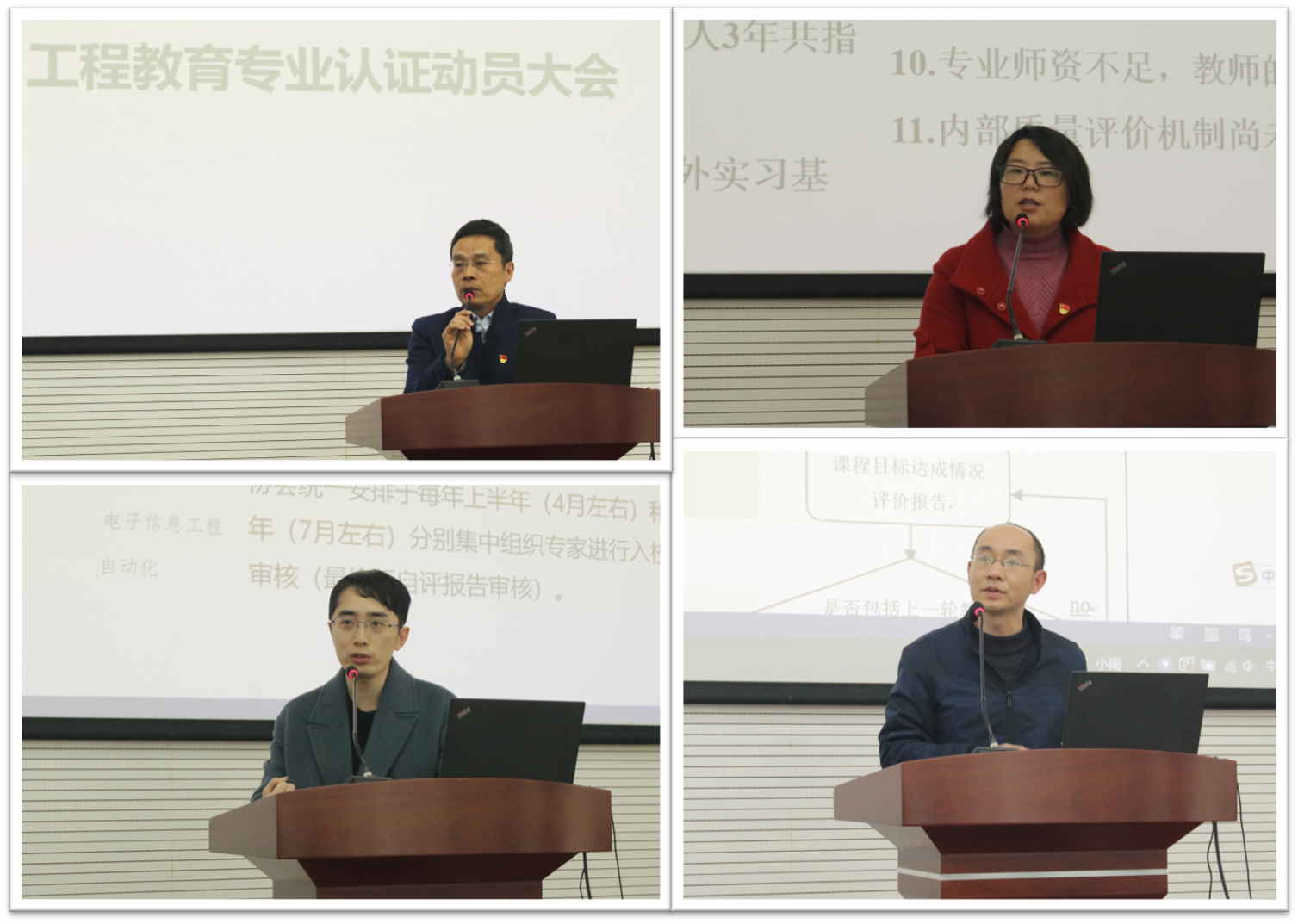 最后,黄进院长再次动员全院教工,他指出,工程教育专业认证是今年学校的重要工作之一,也是学院的重点工作,希望全院师生统一思想,充分认识到认证工作的重要性和紧迫性,共同行动,全力以赴,以工程教育专业认证为契机,持续改进,提升专业人才培养质量,争取电子信息工程专业和自动化专业的工程教育专业认证取得新突破。