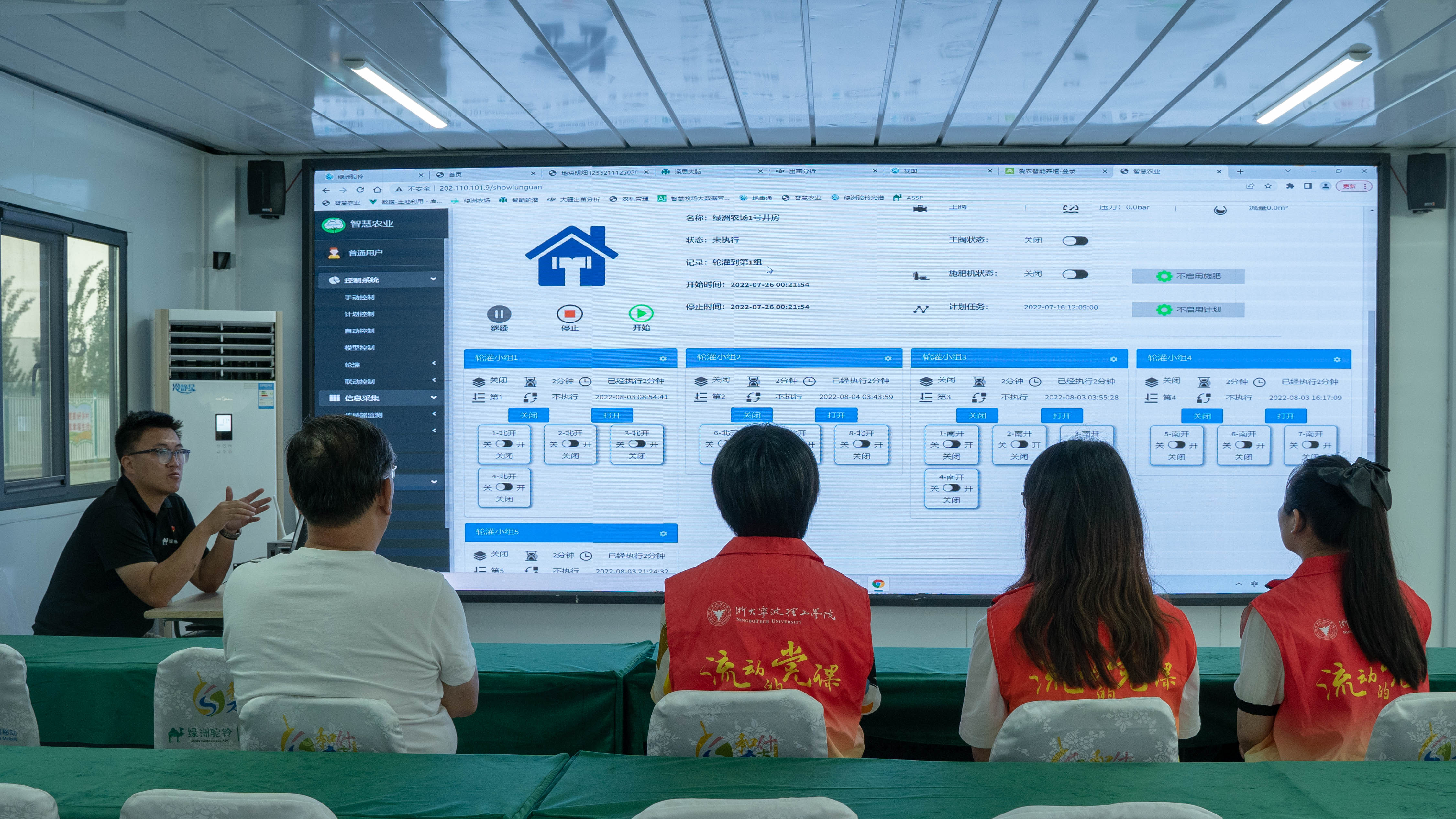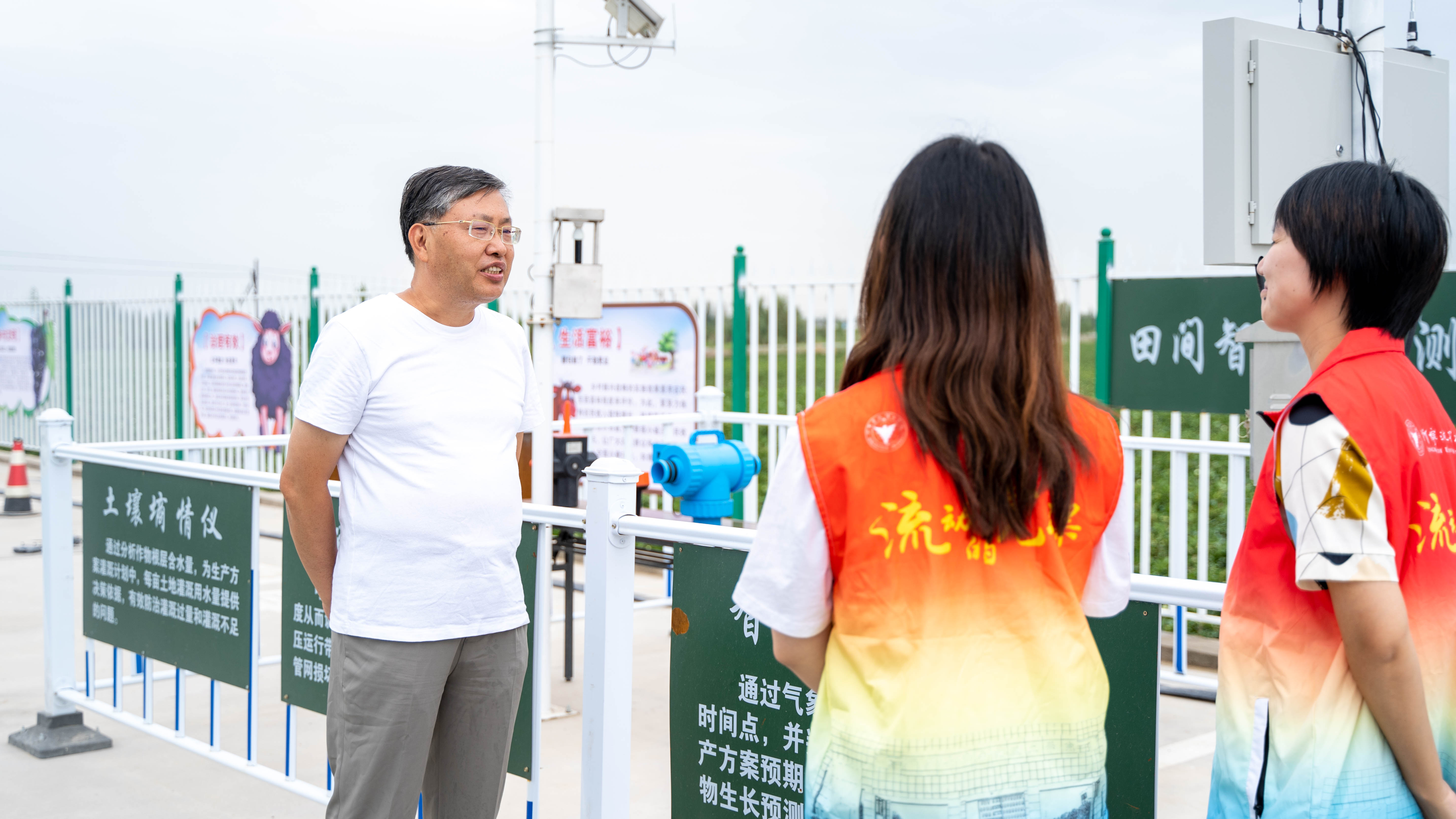 “看似平静普通的棉田,其实运用到了卫星多光谱、土壤监测仪、智能气象站、虫情测报仪、长势监测、智能喷洒设备、水肥一体机、无人机等多项科技;数据平台能够进行多光谱视频监控、网格员作业评估、农机作业监管、灌溉质量监管、农药使用监管等,配套绿洲管家和绿洲小哥APP进行农事任务派发和相关农事指导。在马教授的指导和支持下,我们这套标准化的管理模式使得农场每亩田的用水可节约10%-13%,农药可节约15%-18%,化肥可节约18%以上,劳力可成本节约13%以上,产量可提高8%以上,综合效益能够显著提高。”绿洲驼铃库尔勒分公司总经理、农艺专家熊大振先生向实践团介绍道,“棉花是新疆大面积作物里面流程最长、管理难度最大、新疆种植面积最大的作物;虽然新疆各地棉田机械化、自动化的运用已经比较广泛,但是贯穿棉花种植整个流程的农艺+自动化的智慧棉田标准化建设目前还不完善,而我们在做的正是填补这个空缺,这也是我们最大的优势。”