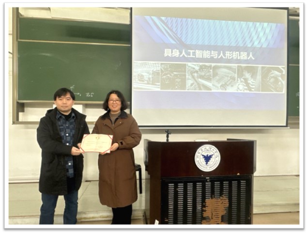 为深化教育教学改革,贯彻落实“校企协同育人”的模式,信息学院结合产业发展现状及专业课程开设情况,持续开展企业导师进课堂活动。3月13日上午,均胜电子副总裁郭继舜莅临我校,在21级自动化专业的《人工智能基础》课程、电子信息工程专业的《机器人工程实训》课程上,为学生带来了一场关于“具身人工智能与人形机器人”的前沿讲座,学院副院长陶吉利为其颁发了企业导师聘书。